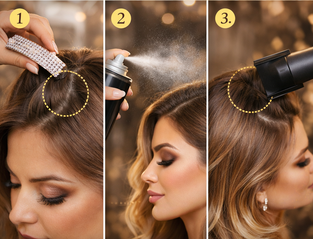 The procedure is very simple. On the part of the hair you want to lift (most often at the crown), place the clip so that it slightly lifts the strand from the root. Then spray that part with hairspray and dry it briefly with a hair dryer to “lock” the shape. The heat combined with the hairspray helps the hair retain its lifted shape.